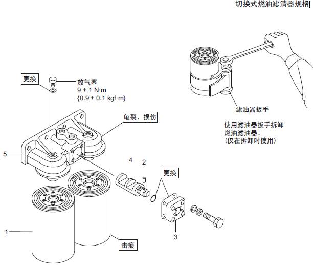 2.1 三菱S6R發(fā)動(dòng)機(jī)燃油濾清器的解體,檢修,組裝( 紙質(zhì)濾芯)