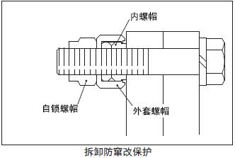 防竄改保護螺帽有2重構造,不能夠簡單的旋轉拆除。拆除時,必須切斷破壞筒形外螺帽,然后才能拆卸內螺帽。