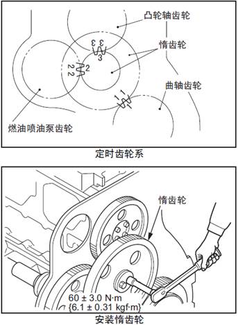 惰齒輪和三菱S6R柴油發(fā)動機凸輪軸齒輪的齒隙 |