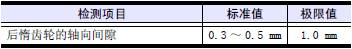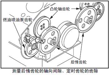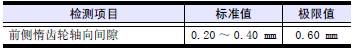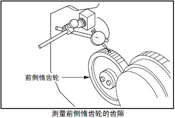 測(cè)量前側(cè)惰齒輪的齒隙,將千分表的表頭放置在齒輪節(jié)圓的圓周線上,與齒面垂直接觸,測(cè)量齒隙量,或在各齒輪的嚙合部分插入厚薄規(guī)進(jìn)行測(cè)量。超過(guò)極限值時(shí)更換新的齒輪。