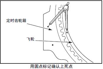 (3) No.1 三菱S12柴油發(fā)動(dòng)機(jī)氣缸上死點(diǎn)的確認(rèn)方法是,在三菱S12柴油發(fā)動(dòng)機(jī)飛輪端面和三菱S12柴油發(fā)動(dòng)機(jī)正時(shí)齒輪箱上打刻有圓點(diǎn)標(biāo)記,當(dāng)3 點(diǎn)之間的距離相同的時(shí)候,既是No.1 三菱S12柴油發(fā)動(dòng)機(jī)氣缸的上死點(diǎn)。