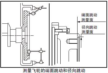 測(cè)量三菱S12柴油發(fā)動(dòng)機(jī)飛輪的端面跳動(dòng)、徑向跳動(dòng)。超過(guò)標(biāo)準(zhǔn)值時(shí),檢查螺栓的緊固狀況、安裝面有無(wú)異物粘附等組裝狀態(tài)。