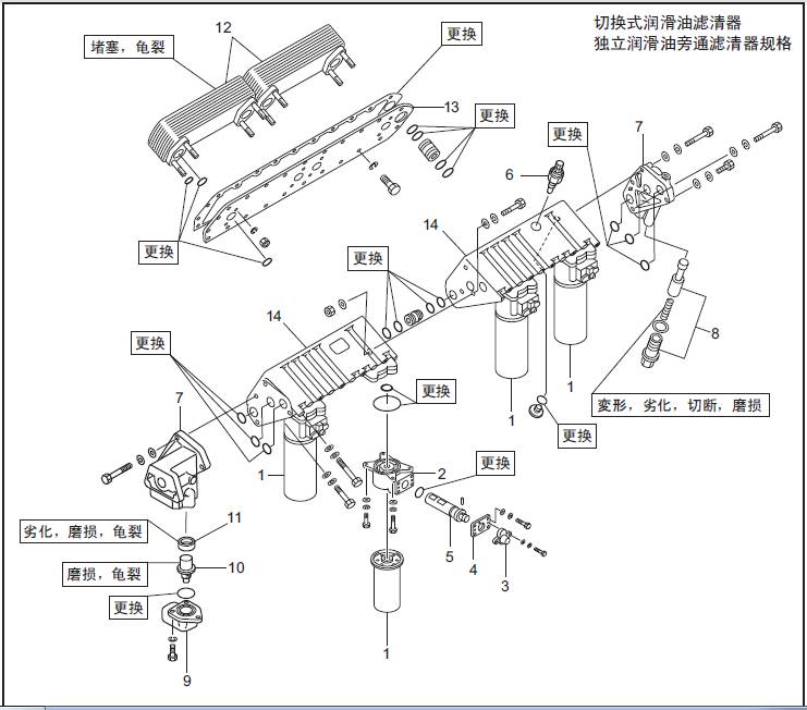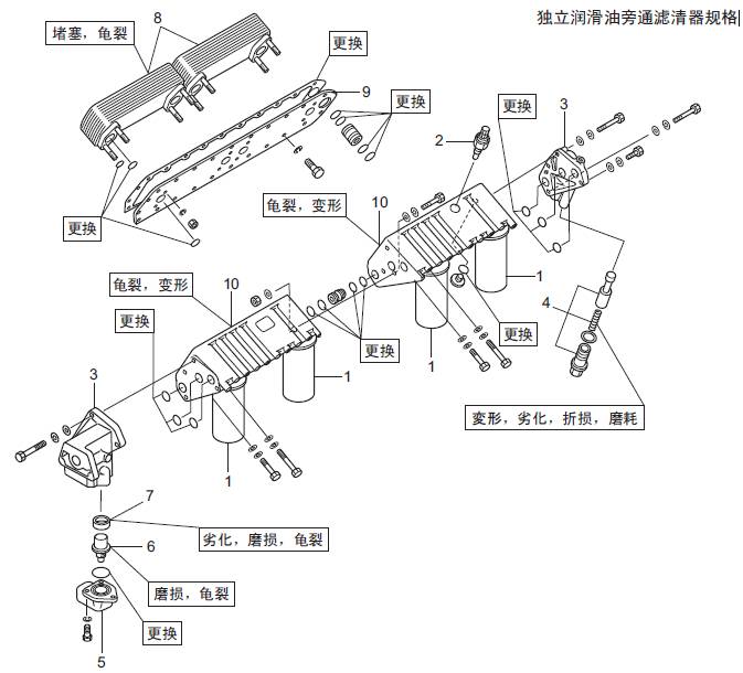 2.4 潤滑油濾清器、潤滑油濾清器報(bào)警器、釋放閥、左側(cè)潤滑油冷卻器的解體、檢修