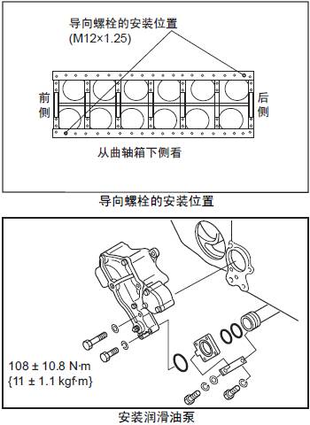 (3) 在三菱S12柴油發(fā)動機(jī)缸體安裝2 個(gè)導(dǎo)向螺栓,安裝油底殼。