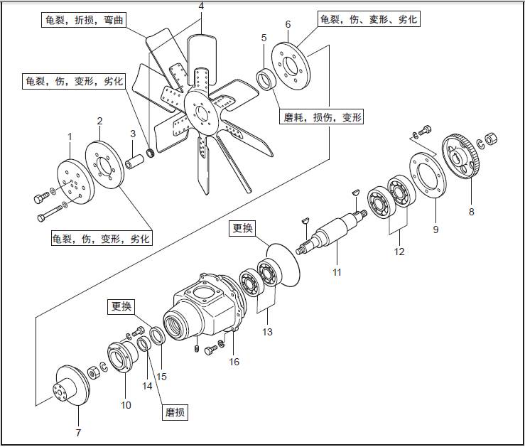 檢測三菱S12柴油發(fā)動機(jī)風(fēng)扇驅(qū)動軸和驅(qū)動器殼體的軸承安裝部位,嚴(yán)重磨損時更換新品。