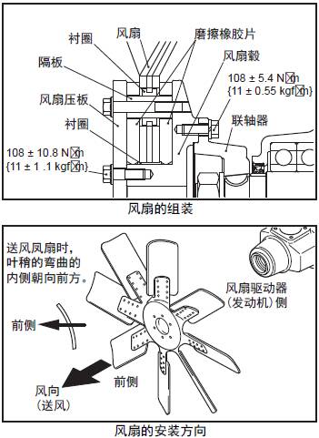 注: 安裝時,注意三菱S12柴油發(fā)動機(jī)風(fēng)扇的安裝方向( 風(fēng)向:排出) 不要裝錯。