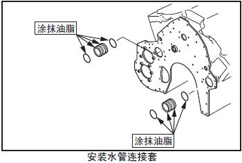 (2) 安裝三菱R16柴油發(fā)動(dòng)機(jī)三菱R16柴油發(fā)動(dòng)機(jī)缸體和齒輪箱的水管連接套,注意不要損傷O形圈。