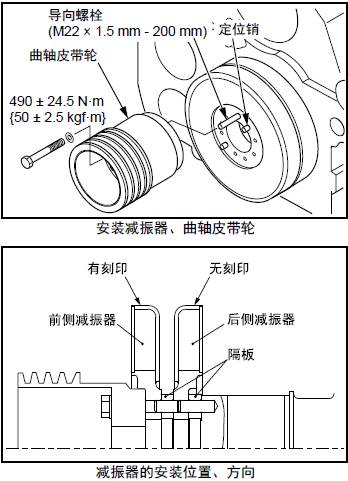 (2) 按照隔板、內(nèi)側(cè)的三菱R16柴油發(fā)動(dòng)機(jī)減振器、隔板、外側(cè)的三菱R16柴油發(fā)動(dòng)機(jī)減振器、三菱R16柴油發(fā)動(dòng)機(jī)曲軸三菱S16柴油機(jī)皮帶輪的順序,通過導(dǎo)向螺栓,對(duì)準(zhǔn)定位銷進(jìn)行安裝。
