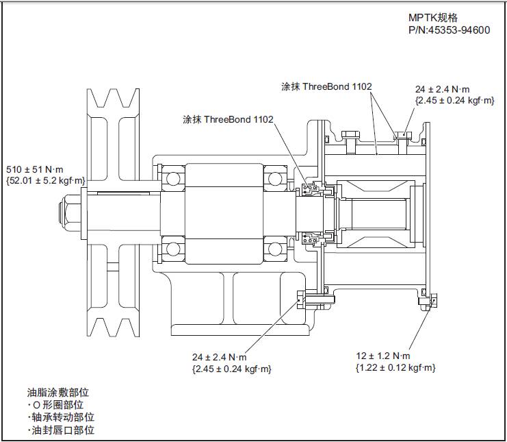 (1) 三菱S16柴油機皮帶輪側的球軸承回轉部分和三菱S16柴油機水泵泵體內(nèi)充填WPH油脂( 協(xié)同油脂㈱生產(chǎn))。