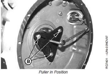 5. Install three 2-1/2 in. (approximate) sheet metal screwswith washers (B) into slots of removal tool and threadscrews into holes in seal casing. Evenly tighten screwsuntil plate is flush with rear face of crankshaft.