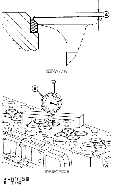 1. 用深度千分表、磁力座千分表或配有 JDG451 高度尺(B) 的千分表測(cè)量并記錄閥門下沉量 (A)。測(cè)量位置必須從氣門邊緣開(kāi)始,最多 3.0 毫米(0.12 英寸)。