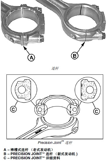 老式John Deere約翰迪爾強鹿柴油發(fā)動機的連桿和連桿瓦蓋之間采用傳統(tǒng)的榫槽式連接 (A)。新式John Deere約翰迪爾強鹿柴油發(fā)動機具有 PRECISION JOINT™ 連桿和瓦蓋 (B)。