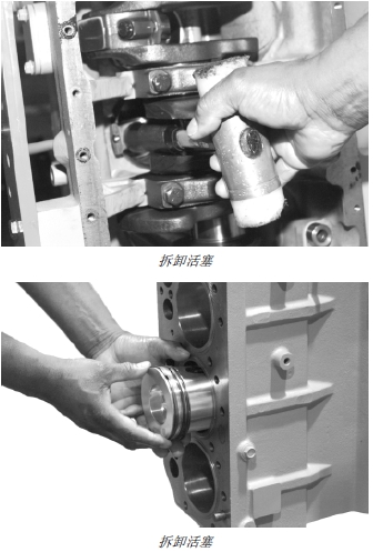 重要提示: 握住活塞,以防活塞掉落。活塞環(huán)脫離汽缸套后,活塞便會掉落。如果重復(fù)使用汽缸套,拆卸活塞和連桿總成時一定要格外小心,不要讓連桿撞擊汽缸套孔。