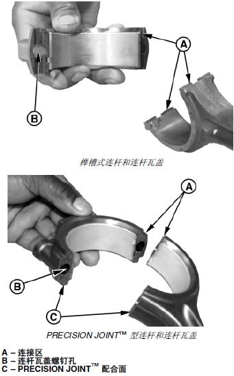 重要提示: 不得劃傷連桿和連桿瓦蓋的連接面。對(duì)于確保 PRECISION JOINT™ 連桿正確安裝來說,這是非常重要的。禁止用鋼絲刷或其他工具刷連接面 (C)。必須保護(hù)互鎖配合面。