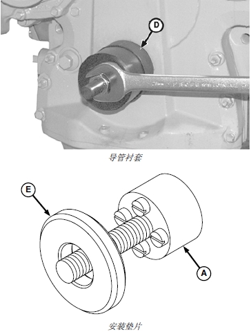 注意: 一些過去生產(chǎn)的正時齒輪蓋,導管襯套上有一個凹槽,可允許鑄造的標記通過。6. 將 JDG954-1 安裝器 (D) 放在轉(zhuǎn)接器上。將 JDG954-