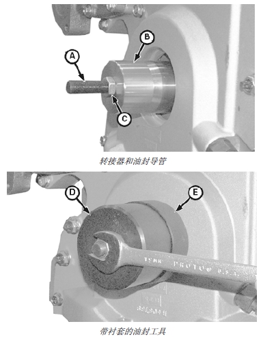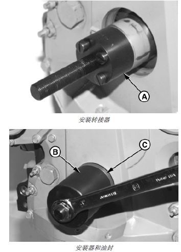 重要提示: 為保證安裝正確,曲軸和耐磨套外徑必須要用 Brake Kleen、IgnitionCleaner 或等效產(chǎn)品進行清洗,風干后再安裝油封 (C)。