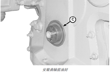 3. 在油封邊上涂上一層干凈的機油,將油封 (C) 裝在曲軸的凸緣上。(油封裝彈簧的一頭應先裝進正時齒輪蓋內(nèi)。)