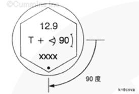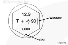 為了精確地使螺釘轉動到要求的角度,使螺釘與螺釘頭上標記的“小圓點”和“窗口”對正,或者使用推薦的扭矩角度計 - 19 mm [3/4-in] 驅動頭(零件號 3823878)或等同物。