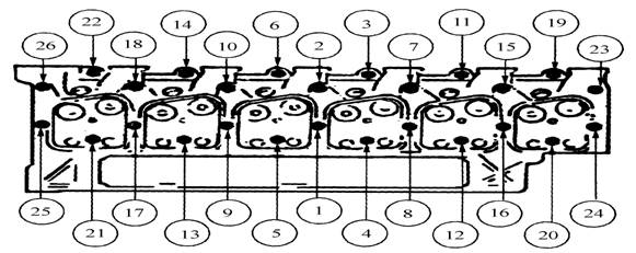 ①氣缸蓋安裝時,應把標有“缸體側”的一面朝向氣缸體,檢查水、油孔是否對齊。氣缸墊用過1次后不能再用??得魉笲系列發(fā)動機氣缸蓋螺栓的擰緊順序如下圖所示。