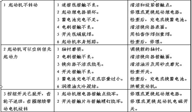 12.在更換起動機前,應(yīng)先檢查鎖匙開關(guān)、中間繼電器、磁力開關(guān)是否有燒結(jié)現(xiàn)象,如發(fā)現(xiàn)有燒結(jié)現(xiàn)象,請先更換這些零件后,再更換起動機,以免起動機重復(fù)損壞。