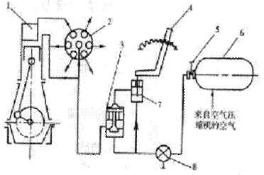 7) 主要部件有:空氣壓縮瓶6、主啟動閥3、空氣分配器2、氣缸啟動閥1和啟動控制閥7。