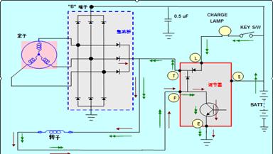 發(fā)動機 IDLE期間引加急劇電流則調(diào)節(jié)器防止發(fā)動機IDLE速度,并為了避免發(fā)動機負載的突然增大,而把轉(zhuǎn)子激磁電流切斷以后逐漸增加電流來減少發(fā)動機的速度變化. 依據(jù)此動作 調(diào)節(jié)器在提高燃比和減少 排廢氣及改善乘車感的方面作出貢獻.