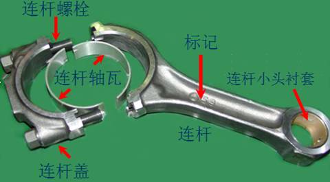 連桿組包括連桿、連桿蓋、連桿螺栓、連桿軸瓦、連桿小頭襯套等。如下圖所示: