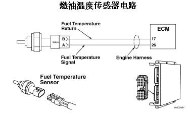 ECM 使用燃油溫度傳感器監(jiān)測燃油溫度。ECM 監(jiān)測觸針 26 上的電壓并將它轉(zhuǎn)換成溫度值。燃油溫度數(shù)值由 ECM 用于發(fā)動機(jī)保護(hù)系統(tǒng)。