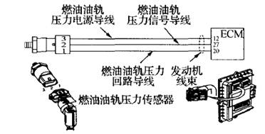 安裝在高壓燃油共軌內(nèi),其功能是:ECM利用該傳感器信號確定油軌中的燃油壓力,同時利用它來計算燃油供油量,工作范圍在0~1500 Ba,。傳感器出現(xiàn)故障將導(dǎo)致發(fā)動機(jī)動力下降、轉(zhuǎn)速降低甚至停車。
