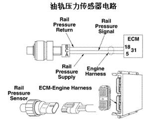 油軌壓力傳感器通過發(fā)動機(jī)線束向 ECM 提供信號。ECM 利用油軌壓力信號監(jiān)測從控制閥體輸送到噴油器計量油腔的燃油量。部件位置,油軌壓力傳感器位于控制閥體的右下側(cè)。