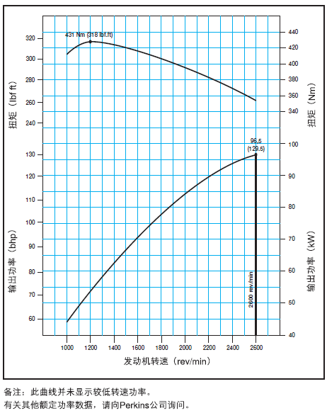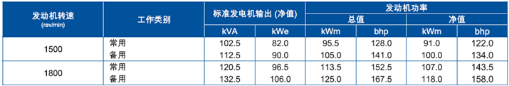 上表所有額定功率數(shù)據(jù)均為配備標(biāo)準(zhǔn)尺寸風(fēng)扃與驅(qū)動器比率的發(fā)動機,ISO/TR 14396/IS0 8528條件下操作時數(shù)據(jù)。有關(guān)上述條件以外操作的數(shù)據(jù)請咨詢珀金斯公司,Perkins提供的性能公差為±5%。電氣參數(shù)假設(shè)功率因數(shù)為0.8與發(fā)動機效率90%。