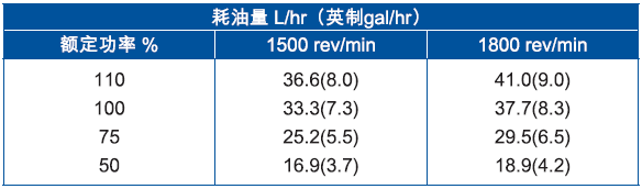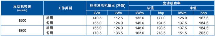 上表所有額定功率數(shù)據(jù)均為配備標(biāo)準(zhǔn)尺寸風(fēng)扃與驅(qū)動(dòng)器比率的發(fā)動(dòng)機(jī),ISO/TR 14396/IS0 8528條件下操作時(shí)數(shù)據(jù)。有關(guān)上述條件以外操作的數(shù)據(jù)請(qǐng)咨詢珀金斯公司,Perkins提供的性能公差為±5%。電氣參數(shù)假設(shè)功率因數(shù)為0.8與發(fā)動(dòng)機(jī)效率90%。