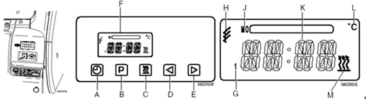 沃爾沃VOLVO B 系列挖掘機發(fā)動機柴油加熱器 A時間設(shè)置開關(guān) B程序開關(guān) C加熱“開/關(guān)”開關(guān) D倒退開關(guān) E前進開關(guān) F顯示窗口G記憶指示器 F遙控器符號 J程序日 K當(dāng)前時間/計劃時間 L溫度顯示器 J加熱指示器