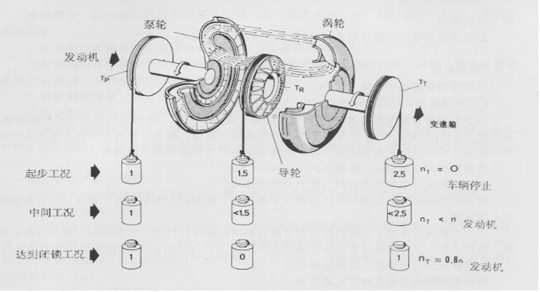 變矩器由泵輪、渦輪和導輪三種旋轉(zhuǎn)元件所組成,由這三個工作輪組成一個循環(huán)圓系統(tǒng)。液體按上述順序通過循環(huán)圓流動,發(fā)動機的機械能,通過泵輪轉(zhuǎn)換為液體的動能,再由渦輪轉(zhuǎn)換為機械能,變速器內(nèi)的供油泵不斷地把壓力油供給變矩器,這樣才能使變矩器工作起作用,即增加發(fā)動機的輸出扭矩,同時通過經(jīng)變矩器排出的油帶走變矩器內(nèi)產(chǎn)生的熱量并將熱量排出。