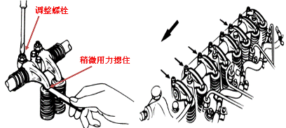 4.盤轉(zhuǎn)曲軸360度,按“雙排不進(jìn)”方法調(diào)整4缸上止點(diǎn)時(shí)氣門間隙