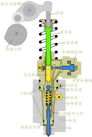1、通過高速電磁閥開閉控制高壓燃油回油通路的開閉時刻從而控制噴油開始及停止的時刻來實(shí)現(xiàn)對噴油提前角及噴油量控制