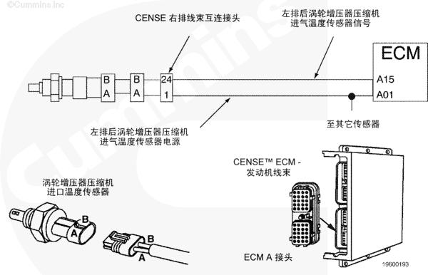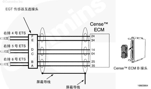 當(dāng)鑰匙處于 ON(接通)或者康明斯發(fā)動(dòng)機(jī)運(yùn)轉(zhuǎn)時(shí),可以使用 Insite™ 來監(jiān)測(cè)排氣溫度傳感器的溫度值以快速檢查電路圖工作情況。有三個(gè)傳感器連接到右排線束上的一個(gè)接頭。為了進(jìn)行系統(tǒng)快速檢查,從有故障代碼的傳感器上斷開傳感器接頭。INSITE™ 讀取到的所有傳感器溫度,除了 9 號(hào)排氣溫度傳感器之外,都應(yīng)為非常低。如果斷開了與 7 號(hào)和 8 號(hào)排氣溫度傳感器相關(guān)的接頭,則 9 號(hào)排氣溫度傳感器讀取到的溫度值會(huì)非常高。短接每個(gè)傳感器的傳感器觸針“排氣溫度傳感器信號(hào)(正極)和排氣溫度傳感器信號(hào)(負(fù)極)”。Insite™ 中新的冷連接點(diǎn)處同一接頭上的傳感器的溫度讀數(shù)都將近似相同。這表示線束、熱電偶放大器和 CENSE™ ECM 正常工作,但傳感器有故障。如果接頭、線束、熱電偶放大器或者 CENSE™ ECM 有間歇性、故障或者腐蝕的連接,則有故障代碼的排氣溫度傳感器的溫度值響應(yīng)將不會(huì)如上所述。將需要對(duì)系統(tǒng)的其余部分進(jìn)行故障診斷以確定有故障的部件。該過程假定同一個(gè)傳感器
