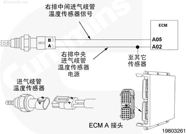 右排中間進(jìn)氣歧管溫度傳感器電路圖向 CENSE™ ECM 提供右排中間進(jìn)氣歧管空氣溫度信號。