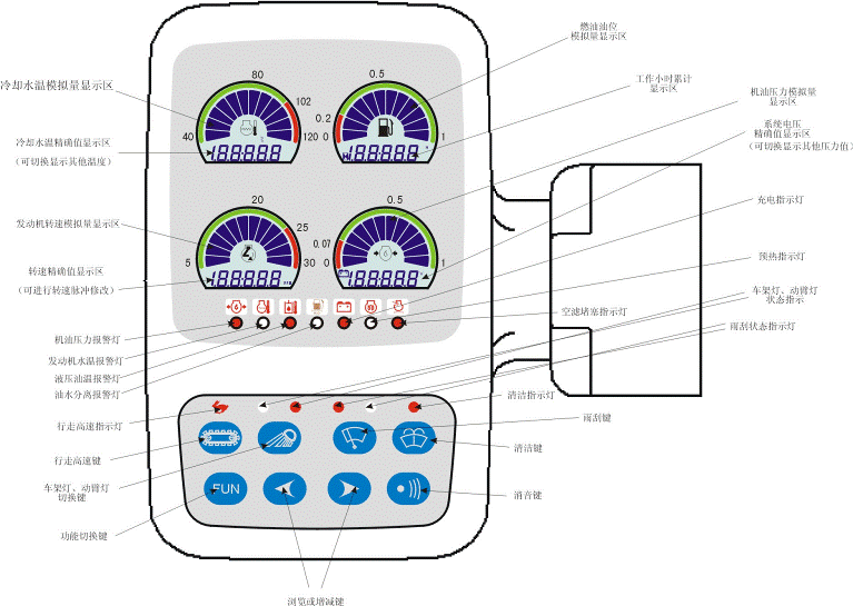 18、按鍵功能切換檢測:按動FUN按鍵,儀表將在工作小時數(shù)和機油壓力精確值之間切換顯示,當處于機油壓力精確值顯示時,按動左鍵或右鍵也能實現(xiàn)工作小時數(shù)和機油壓力精確值之間的切換功能,說明儀表功能按鍵正常。