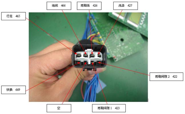 16、按鍵雨刮輸出檢測:在儀表上電的情況下,按動雨刮按鍵一次,儀表如圖2護套(423號線)接頭輸出對地12V電壓,燈光相應指示燈點亮;按動燈光按鍵二次,儀表如圖護套(422號線)接頭輸出對地12V電壓,燈光相應指示燈點亮;按動燈光按鍵三次,儀表426號線接頭輸出對地12V電壓,燈光兩指示燈同時點亮,說明儀表行走輸出正常。