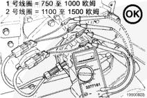 注: 測量車速傳感器線圈的電阻值時,使用 2 個陰性測試導線。這樣就可以輕微地彎曲傳感器的電氣導線,以便檢查絕緣層下面的導線股是否損壞或部分斷裂。