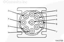 如果提供了(屏蔽)觸針,則測量 9-針 Deutsch™ 接頭的 SAE J1939 數(shù)據(jù)通信接口(屏蔽)觸針與發(fā)動機缸體或底盤接地之間的電阻。SAE J1939 數(shù)據(jù)通信接口屏蔽必須接地在車輛蓄電池接地處。萬用表必須顯示為閉路(10 歐姆或更?。?。如果電路不是閉路,請參考《OEM 故障診斷及排除手冊》了解維修說明。