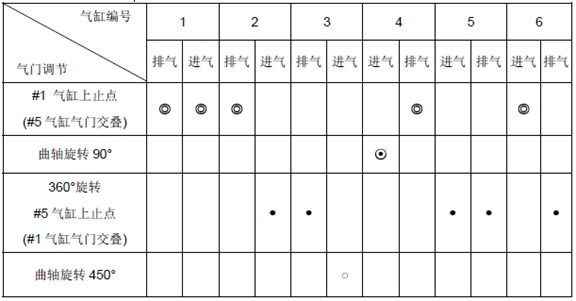 5) 當5 號氣缸處于上止點時,根據(jù)列表中“●”調(diào)整氣門間隙 。