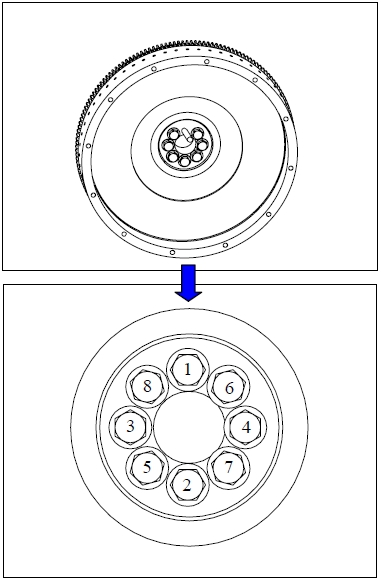 � 將導(dǎo)向銷插入飛輪孔中并暫時(shí)擰緊固定螺栓2∼3 個(gè)螺紋后,按擰緊順序(鋸齒形順序)將其擰緊至規(guī)定扭矩。