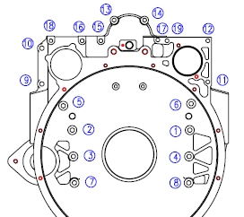� 在將飛輪殼孔與導(dǎo)向銷配合,并將固定螺栓擰緊2∼3 個(gè)螺紋后,按照擰緊順序(鋸齒方式)擰緊固定螺栓至規(guī)定扭矩。