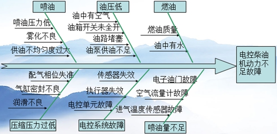 柴油中混入水分,或油路中存有空氣; 柴油質量不符合規(guī)定要求; 油箱開關未完全打開、電動輸油泵有故障(供油不足),或燃油管路部分阻塞; 空氣濾清器或進氣管道阻塞; 排氣管積炭過多,或不適當地將排氣管道改細、加長; 排氣催化裝置有故障 |
