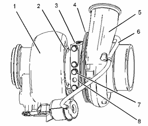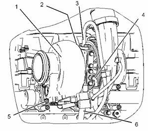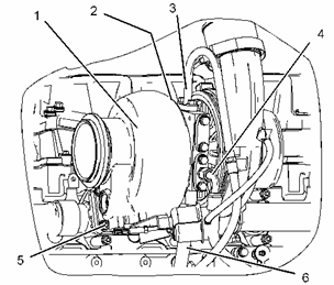 將適當起吊設備連在渦輪增壓器 (1) 上。 渦輪增壓器的重量約為 34 kg (75 lb)。將渦輪增壓器 (1) 安置在排氣歧管上。