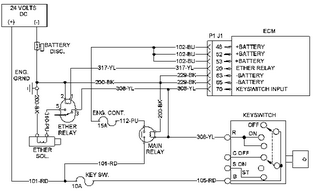 乙醚噴射系統(tǒng)可改善發(fā)動(dòng)機(jī)的寒冷天氣起動(dòng)性能。電子控制模塊(ECM)控制著乙醚噴射系統(tǒng)。 如果發(fā)動(dòng)機(jī)停機(jī)為激活狀態(tài)的話,乙醚噴射系統(tǒng)將被停用。