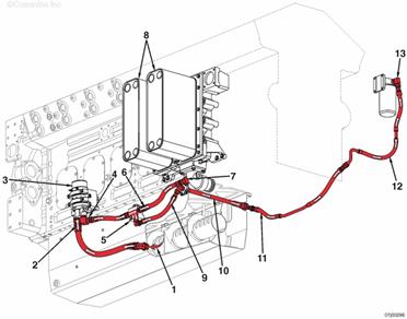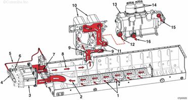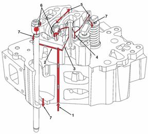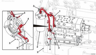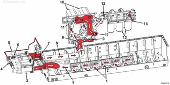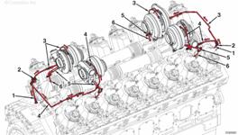 來自康明斯QSK95缸體的機油 至排氣門搖臂軸的機油供應(yīng) 至進(jìn)氣門搖臂軸的機油供應(yīng) 至搖臂軸的機油供應(yīng) 至搖臂腳的機油供應(yīng) 至搖臂調(diào)節(jié)螺釘和推管的機油供應(yīng) 排放至油底殼的機油。