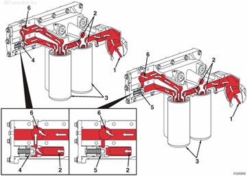 至機油濾清器座的機油供應(yīng) 流入機油濾清器外壁的機油供應(yīng) 康明斯QSK95機油濾清器 機油濾清器旁通閥打開 機油濾清器旁通閥關(guān)閉 從機油濾清器流至缸體主油道的機油供應(yīng)